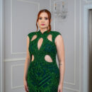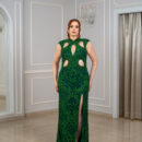 Este vestido verde é puro luxo e presença. O bordado intricado com pedrarias em tons de verde forma um design geométrico hipnotizante, criando um efeito visual de movimento e profundidade. O decote em V profundo e os recortes laterais audaciosos revelam a silhueta com sensualidade e estilo, enquanto a fenda frontal adiciona fluidez e atitude ao look.
