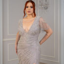 Este vestido prata com bordados prata é puro encantamento para noites memoráveis. A transparência estratégica valoriza o corpo com leveza, enquanto o bordado em pedrarias forma um desenho de ondas e folhagens em movimento, que cintila com cada passo.
